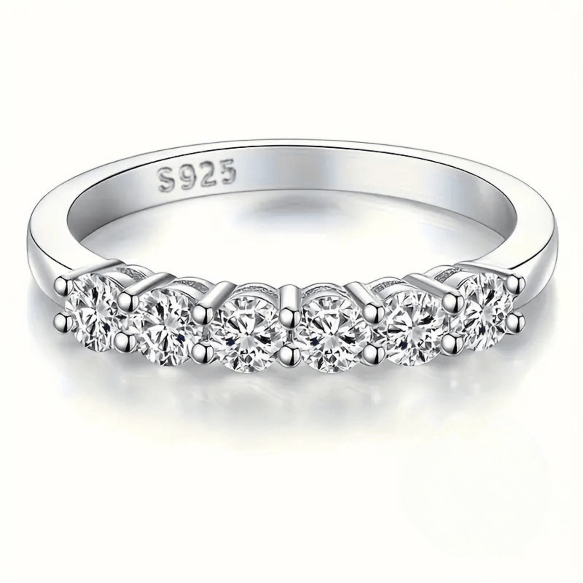 The band is approximately 2.5mm wide and weighs 2.2 grams. It holds seven round-cut CZ stones, each measuring about 3mm. The ring is available in US sizes 6 through 10.